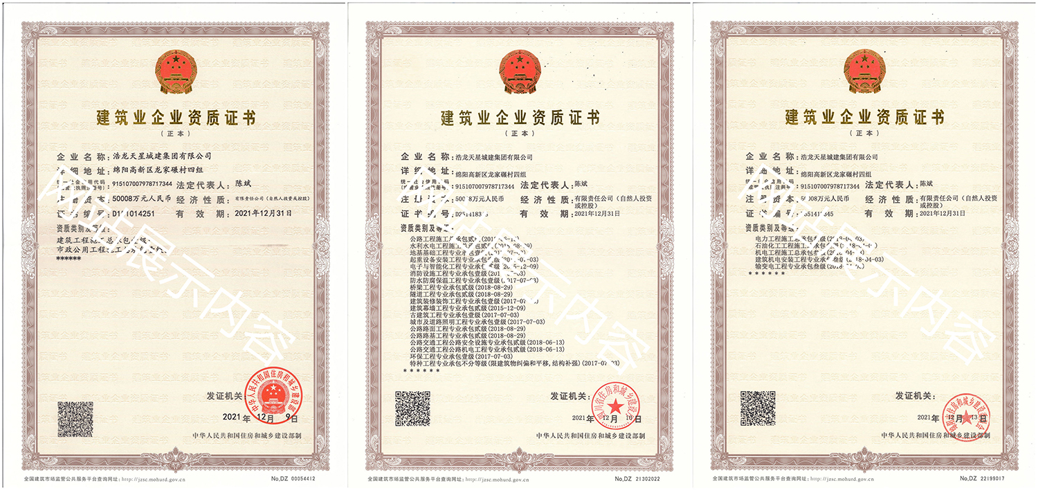 浩龍?zhí)煨浅墙瘓F(tuán)有限公司,2007年成立于“李白故鄉(xiāng)、中國科技城”—四川省綿陽市,企業(yè)注冊資本金5.0008億元。公司共有27項(xiàng)建筑業(yè)企業(yè)資質(zhì),其中國家一級資質(zhì)11項(xiàng),二級資質(zhì)10項(xiàng),三級資質(zhì)5項(xiàng),特種資質(zhì)不分等級1項(xiàng),類別涵蓋建筑、市政、水利、機(jī)電、隧道、起重設(shè)備安裝等基礎(chǔ)及未來發(fā)展重點(diǎn)專業(yè)。公司下設(shè)三個(gè)辦事處,業(yè)務(wù)范圍輻射全國,在建項(xiàng)目三十余個(gè),累計(jì)完成產(chǎn)值超11億元。公司是綿陽市建筑施工企業(yè)協(xié)會副會長單位、綿陽遂寧商會會長級單位、綿陽首批建筑業(yè)綠卡企業(yè),在綿陽本地企業(yè)中綜合實(shí)力名列前茅。